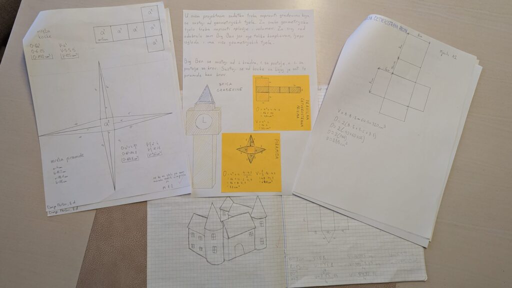 Učenici 8. d razreda sudjelovali su u zanimljivom i kreativnom projektnom radu iz matematike na temu „Arhitektura i geometrijska tijela”. Zadatak učenika bio je izraditi modele građevina koristeći različita geometrijska tijela. Ovim projektom učenici su na praktičan način povezali matematička znanja s arhitekturom te razvijali kreativnost, preciznost i prostornu percepciju. Uz izradu modela, učenici su imali zadatak izraditi i pisani rad u kojemu su prikazali matematičke izračune volumena i oplošja geometrijskih tijela koja su koristili u svojim modelima.